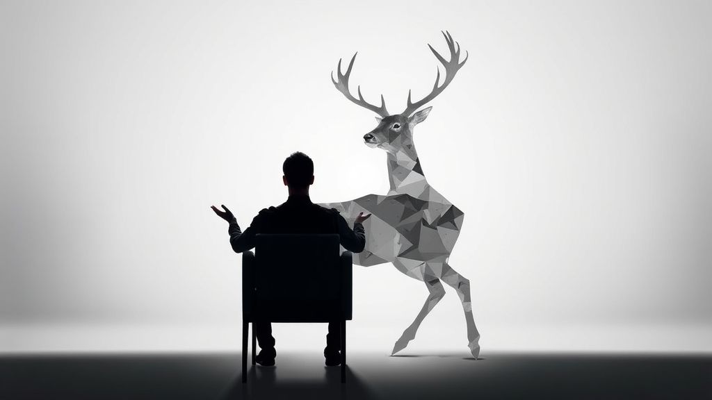 Surreal digital art depicting a person sitting on a chair with their body facing forward and hands outstretched, creating a calm, reflective posture. In front of them, a distorted, fragmented silhouette of a large antlered deer emerges, as if disintegrating into a series of abstract geometric patterns. The background is minimalistic, with soft gradients in black and white, highlighting the contrast between the human figure and the ethereal deer. The artwork has a dynamic sense of movement, with the disintegration flowing outward from the creature, blending human and animal elements in a digital, abstract style.