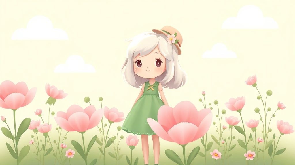 Whimsical and dreamy digital illustration of a cute girl with soft white hair, wearing a green dress with a flower on her hat. The character stands surrounded by oversized, soft pink flowers and delicate plants in a serene, pastel-colored landscape. The background features a soft, light green hue with fluffy white clouds, creating a calm and playful atmosphere. The style is cartoonish, with smooth, rounded shapes, a simple color palette of greens, pinks, and whites, and a light, airy feel.