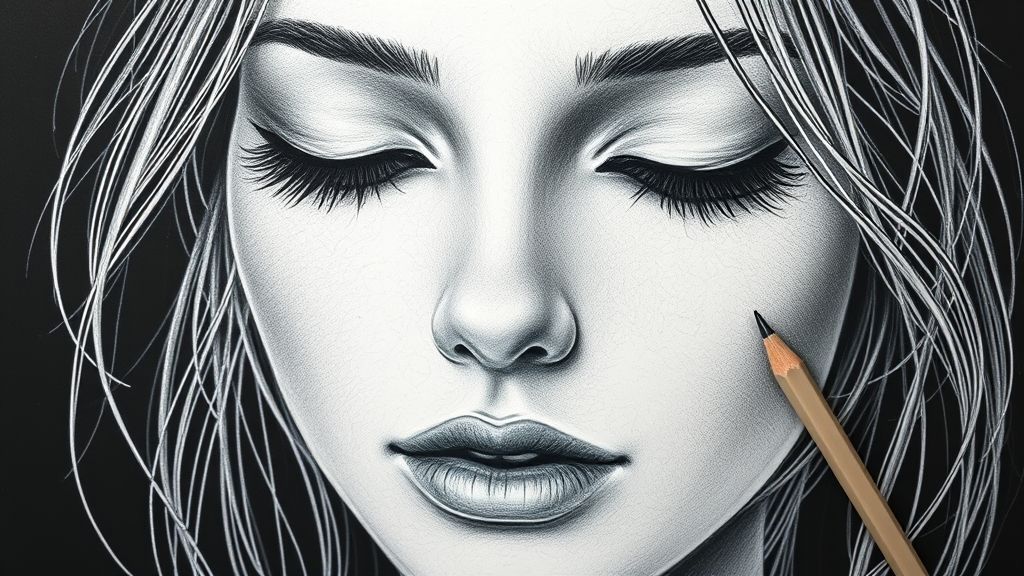 Close-up of a woman with closed eyes, surrounded by thin white pencil lines on a dark background, conveying a sense of calm and serenity. The focus should be on the softness of her facial features such as lips, nose, and eyelashes, as well as on the intricate lines creating the texture of hair and skin. The contrast between the black background and fine white strokes should emphasize the detailing of the blending and create a fairytale atmosphere. Next to the drawing, a pencil is placed, giving it an artistic and unfinished look.