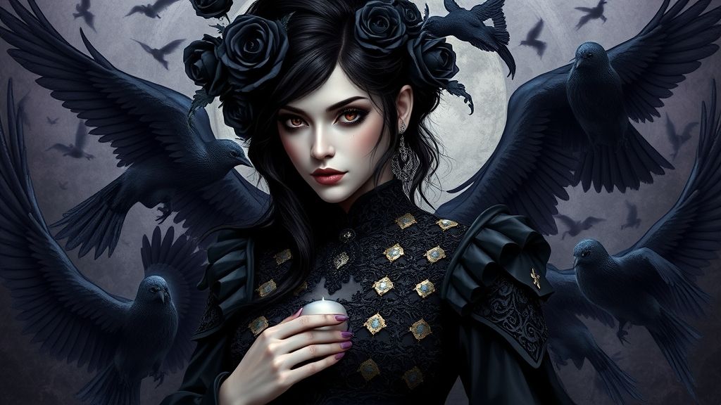 این پرامپت برای ساخت تصویری از زن جوانی که در لباس سیاه با عناصری از هنر گوتیک احاطه شده است طراحی شده است.