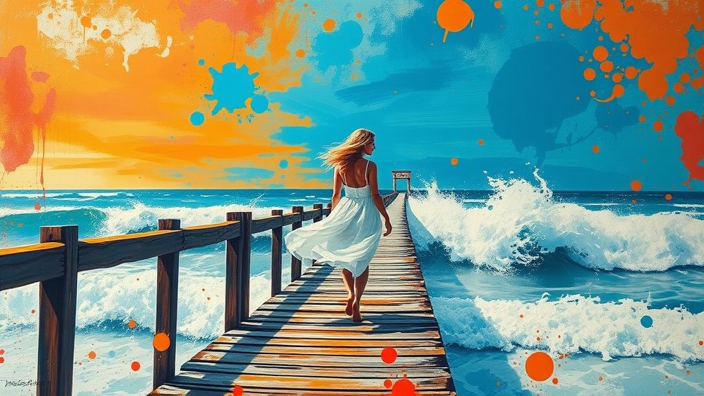 A woman in a flowing white dress walking along a wooden pier, her hair blowing in the wind. The scene is painted in an abstract, vibrant style with splashes of bright colors like orange, blue, and red blending into the sky and water. The ocean waves crash around the pier, creating a dynamic contrast against the soft, ethereal figure of the woman. The background is filled with bold, colorful splatters, evoking a sense of movement and freedom in a dreamlike, painterly atmosphere.