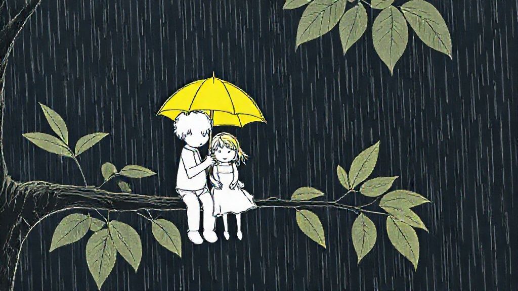 Dark rainy background with real photo texture, tree branch and big leaves. Two minimal white line-drawn characters sitting on the branch, boy holding a yellow umbrella over a sad girl. Simple sketch outlines over realistic photo, contrast of drawing and reality, emotional mood.