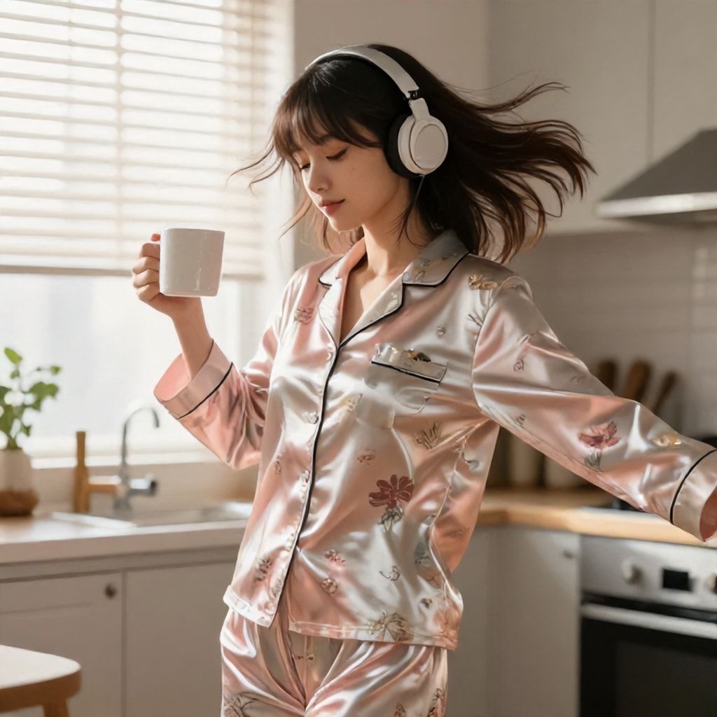 Photorealistic airbrush style with subtle anime notes, dynamic dance movement with a mug in hand, early morning coffee vibe, soft natural lighting streaming through window blinds, silky reflective pajamas with intricate floral patterns, loose hair flowing in motion, headphones on ears, warm and cozy kitchen background, high detail, cinematic lighting, shallow depth of field, warm pastel color palette, hyper-realistic textures, vibrant energy.