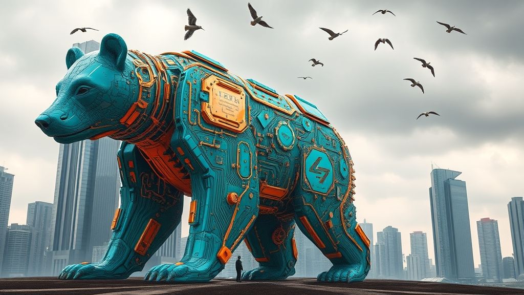 A giant bear made of complex digital circuits and mechanical details shimmering in turquoise and orange tones. The bear majestically stands against a futuristic urban landscape with tall buildings in the background. In the foreground stands a solitary figure, appearing small against the backdrop of the enormous bear, which is composed of detailed geometric shapes, patterns on circuit boards, and metallic textures. The sky is overcast with clouds, and birds fly overhead, creating a surreal and science-fiction atmosphere.
