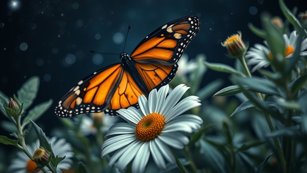 Close-up of a monarch butterfly with intricate details, sitting on a daisy among delicate leaves against a dark starry sky. The butterfly's wings are orange with black-and-white patterns, and the flowers are soft, with detailed textures on the petals and in the center. The surrounding foliage is finely rendered, creating a soft, artistic atmosphere through the interplay of light and shadow.