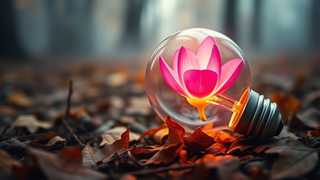 A glowing light bulb resting on the autumn forest floor, with a bright pink flower slowly blooming inside. The camera gently pans around the bulb as the petals unfurl, emitting a soft, magical glow that illuminates the surrounding fallen leaves. The atmosphere is dreamlike, with soft mist and warm autumn tones in the background.