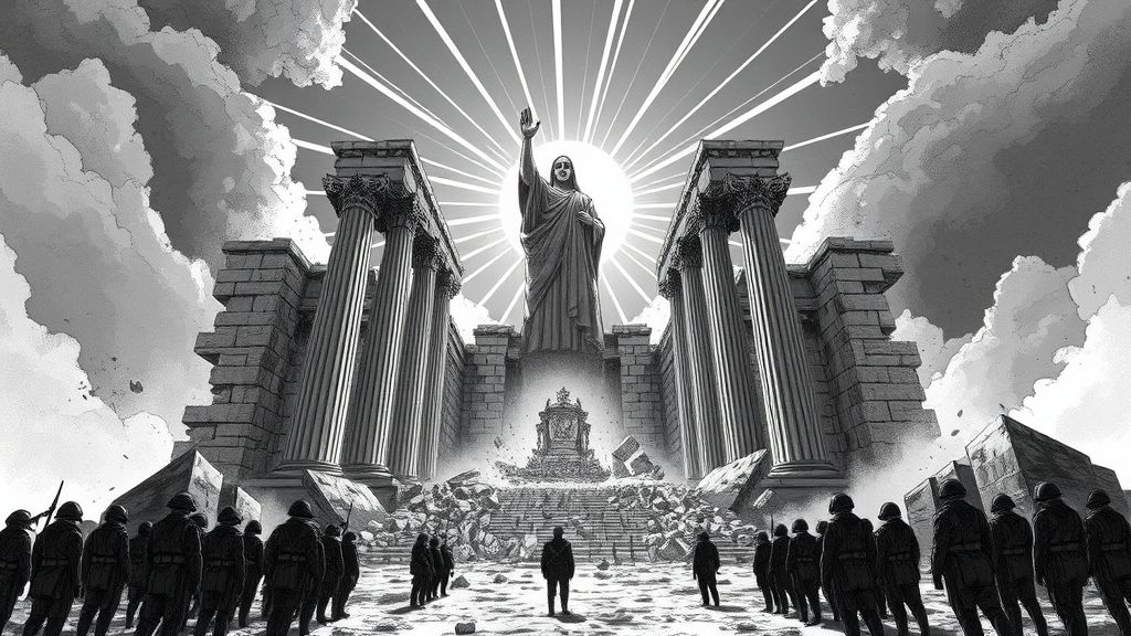 “`A dramatic surreal illustration of soldiers in dark uniforms standing before a colossal crumbling temple, its massive stone columns collapsing into rubble and dust. At the center, a towering statue of a robed figure with a raised hand emerges from the ruins, glowing with divine light. Sun rays burst outward from behind the temple, illuminating the sky with radiant lines, while clouds of smoke and debris swirl around. The scene feels apocalyptic, monumental, and awe-inspiring, with a muted monochrome palette and highly detailed hand-drawn style.“`