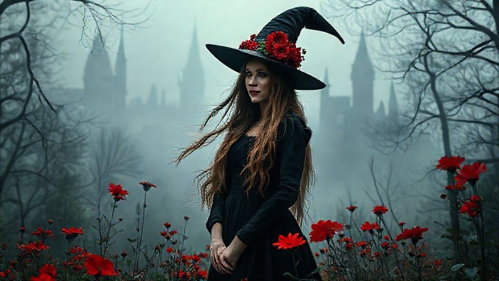 A witch in a black dress and a tall hat adorned with red flowers stands amidst a foggy forest. Her long hair flows in the wind, and her face expresses thoughtfulness. Bright red flowers grow around her, and silhouettes of ancient castles can be seen in the background. The atmosphere is dark, mysterious, and thrilling.