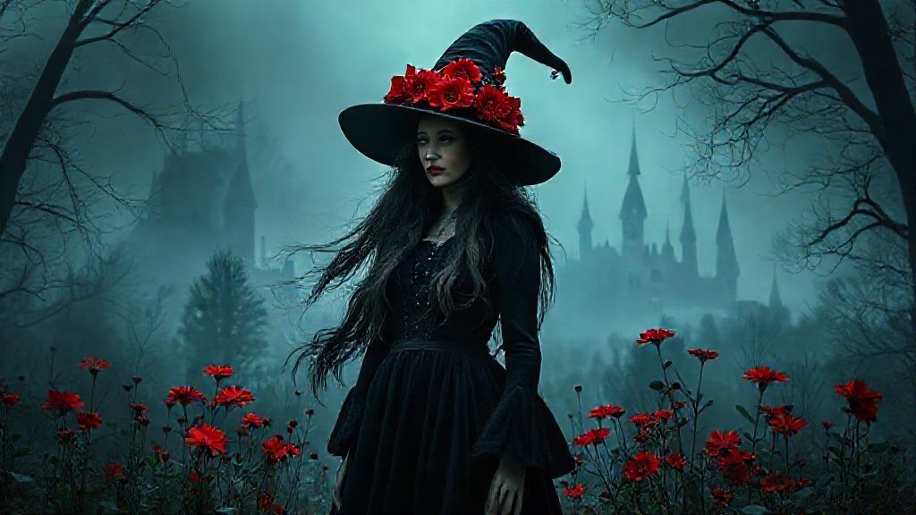 A witch in a black dress and a tall hat adorned with red flowers stands amidst a foggy forest. Her long hair flows in the wind, and her face expresses contemplation. Bright red flowers grow around her, and the silhouettes of ancient castles are visible in the background. The atmosphere is dark, mysterious, and exciting.