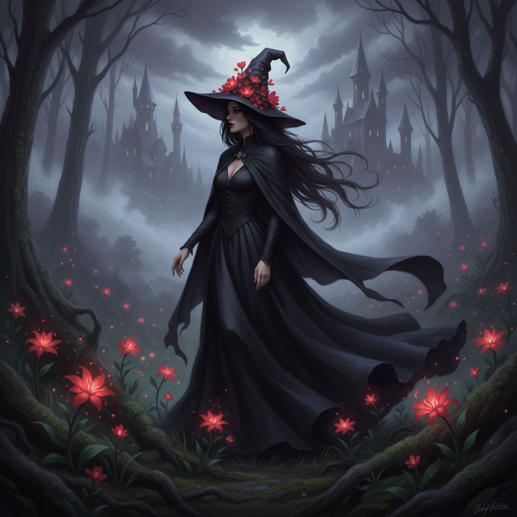 A witch in a black dress and a tall hat adorned with red flowers stands in a misty forest. Her long hair flows in the wind, and her face expresses contemplation. Bright red flowers grow around her, and the silhouettes of ancient castles are visible in the background. The atmosphere is dark, mysterious, and thrilling.