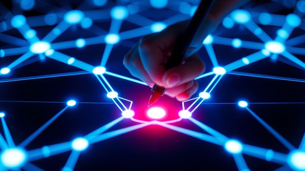 Close-up view of a futuristic, glowing digital grid with interconnected dots and lines. A hand is holding a stylus, drawing on the grid. The grid is composed of bright blue and white dots connected by lines, with a central glowing red dot. The background is black, creating a contrast with the luminous elements, giving a high-tech and cosmic feel.