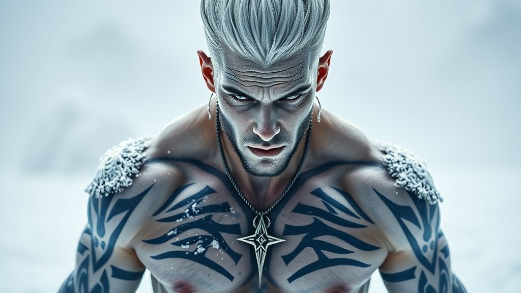 White Walker king emerging from blizzard, pumped up chiseled upper body with frosted tattoos, icy blue eyes that chill and attractive, Maxim cover glamour goth style, silver crowned, arctic mist swirling, supernatural and magnetic, powerful fantasy male model look