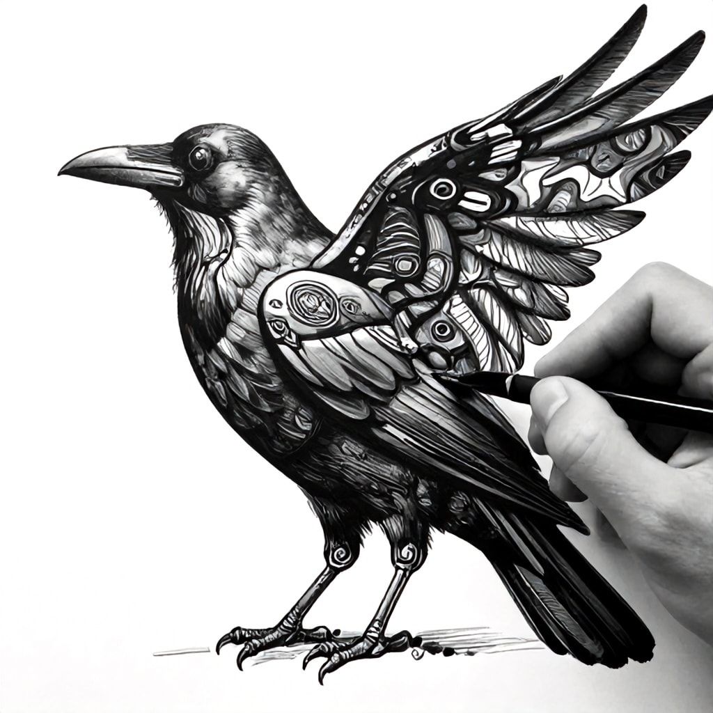 A surreal black and white artwork of a humanoid crow being painted by a human hand, intricate feather and mechanical textures blending together, detailed abstract patterns forming wings and plumage, high contrast ink illustration style, dynamic composition, fine art aesthetic, hyper-detailed, expressive, surrealist painting