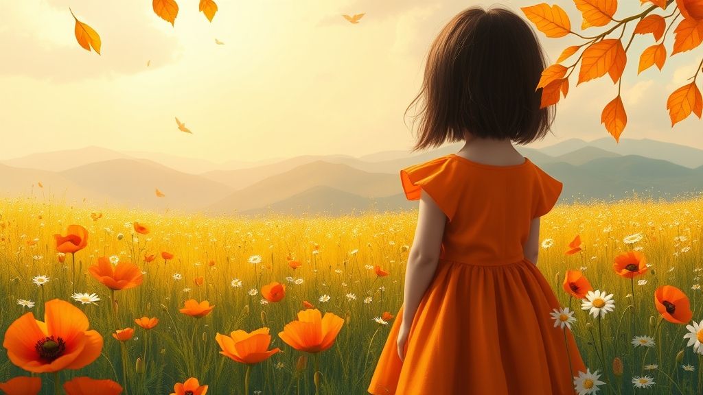 “`A little girl with dark brown hair, dressed in an orange dress, stands in the middle of a lush, bright field scattered with poppies and daisies. She is facing away from the viewer, looking at the distant mountains under a soft cloudy sky. The scene is bathed in warm golden light, and orange leaves circle around her, creating a magical, serene atmosphere. The style of the painting is soft and fairy-tale-like, with a gentle and peaceful mood reminiscent of an illustration from a storybook.“`