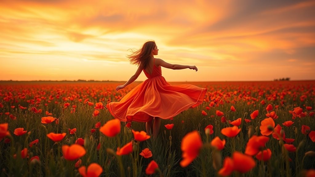 A serene field of poppies under a sunset sky, with a girl in an orange dress spinning gracefully in the center. The camera slowly rotates around her as she twirls, creating a dynamic, dreamy atmosphere. The sky glows in warm tones of orange and pink, while the girl’s dress flows with the motion. The poppies sway gently in the wind, enhancing the tranquil, whimsical vibe of the scene.