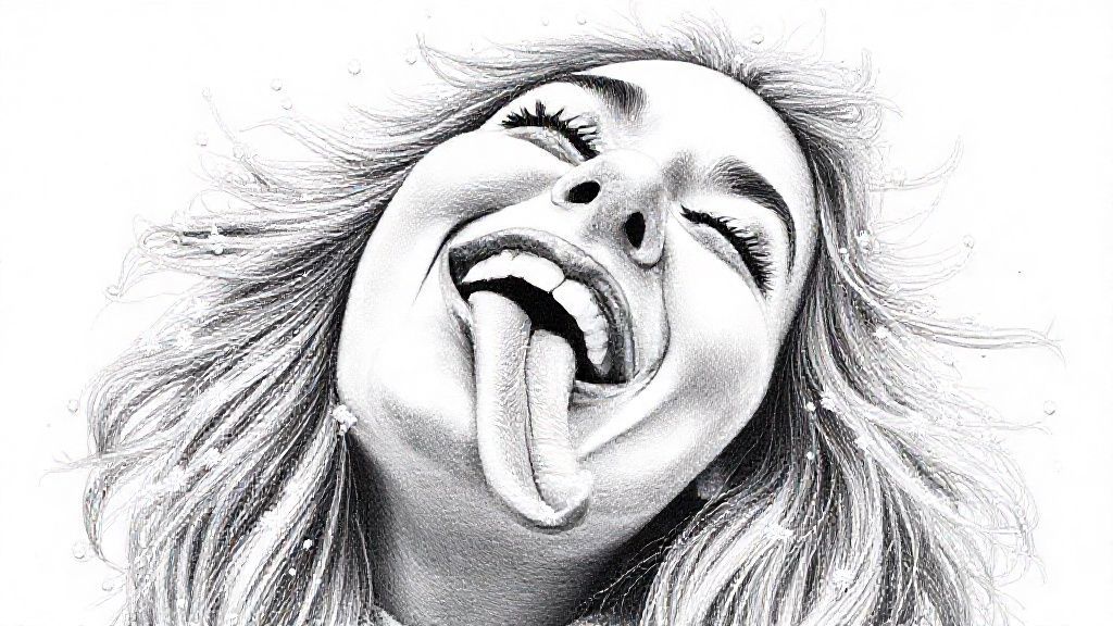A hyperdetailed photorealistic black and white pencil sketch of a young women with her head tilted back, her eyes closed and her tongue sticking out trying to catch snowflakes on her tongue. Snowflakes on voluminous hair. A wide smile. The point of view is positioned directly over her head pointing straight down. Long tongue. Pencil art.