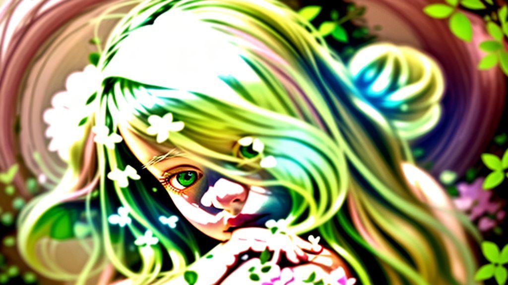 Soft and dreamy digital portrait of a girl with large, expressive green eyes, a gentle pink blush, and delicate features. Her hair is adorned with green leaves and small pink flowers, giving her a nature-inspired, ethereal appearance. The background is a blend of light green and pastel pink tones, with scattered floral elements and soft brushstrokes, creating a serene and whimsical atmosphere. The overall look is stylized and magical, with a focus on soft lighting and smooth gradients.